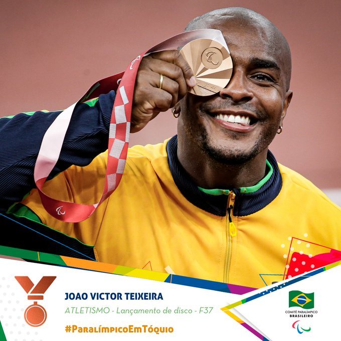 João Victor Teixeira assegurou sua segunda medalha de bronze nas Paralimpíadas de Tóquio ao ficar na terceira colocação na disputa do lançamento de disco da classe F37 (atletas andantes com paralisia cerebral).