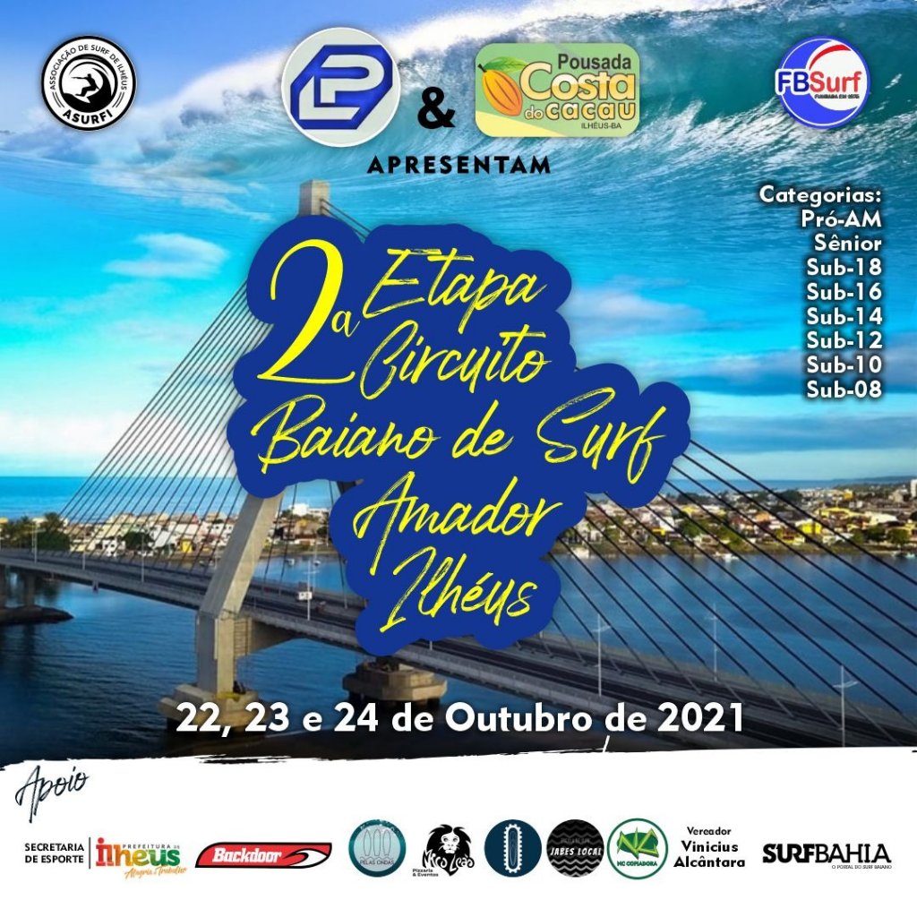 PL Pernalonga Surfboards e Pousada Costa do Cacau apresentam, com o apoio de: Prefeitura Municipal de Ilhéus, Secretaria Municipal de Esportes, Surfbahia.com.br, @JabeslocalSurfSchool, @PelasOndas, @NcCopiadora, @IosShaperService, @MicoLeão Pizzaria e @Back Door.
