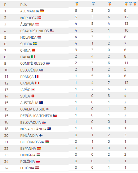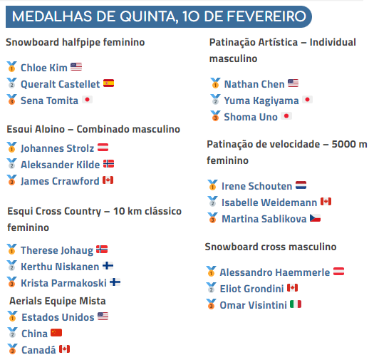 Confira o quadro de medalhas atualizado dos Jogos Olímpicos de Inverno de Pequim-2022: