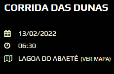 O percurso da prova é em terreno variado, com trechos íngremes, contento chão batido, dunas e trilhas, nas modalidades: CORRIDA 7 Km , CORRIDA DE 3 KM e Caminhada