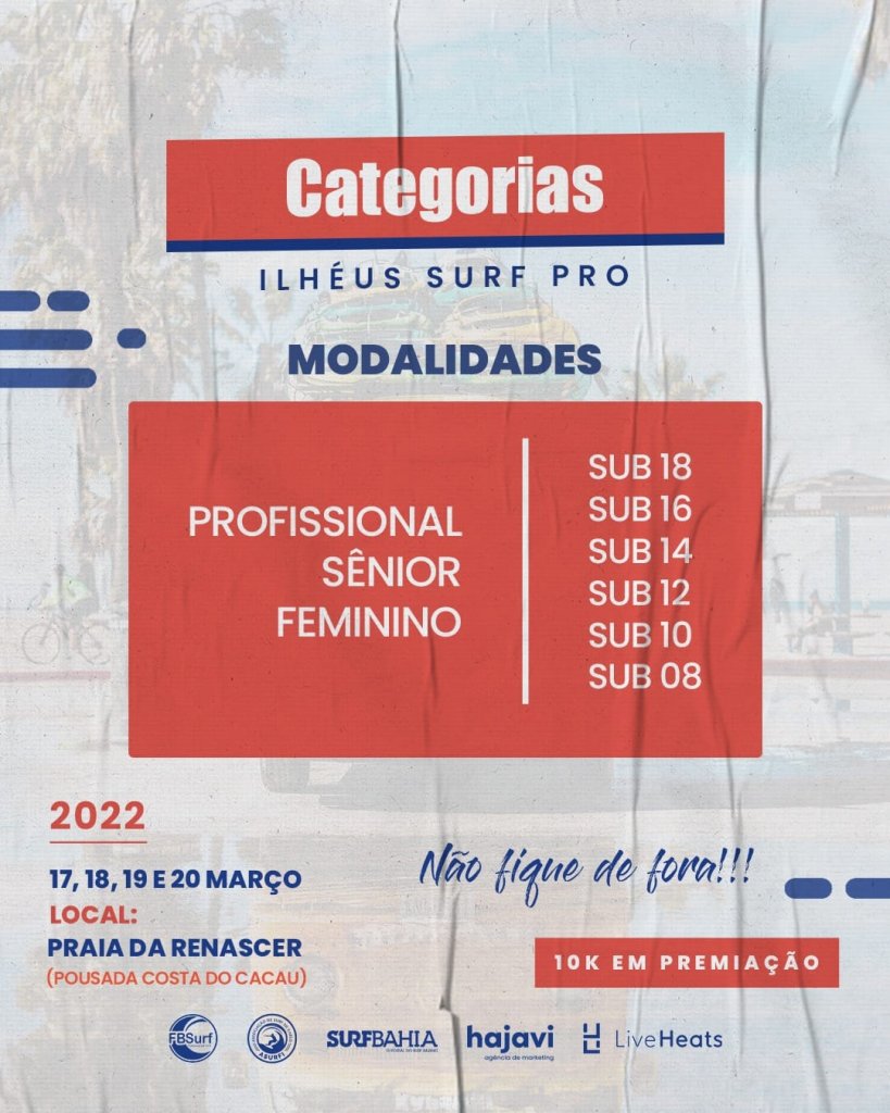 O evento acontece na praia da Renascer, na zona sul de Ilhéus e vai contar com disputas nas categorias amadoras Sub 8, 10, 12, 14, 16 e 18 , Sênior e Feminino, além da Profissional, que vai distribuir 10 mil reais em premiação. A prova acontece entre os dias 17 e 20 de março e as inscrições já estão abertas. Mais informações (73) 99115-0808.