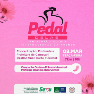 No Dia Internacional da Mulher, comemorado nesta terça-feira (08), a Prefeitura de Camaçari realizará o evento de ciclismo, intitulado Pedal Delas. A atividade, que conta com o apoio do Grupo Ciclovia em Ação, tem saída do pátio da prefeitura, a partir das 18h, em direção ao Horto Florestal Linaldo da Silva.