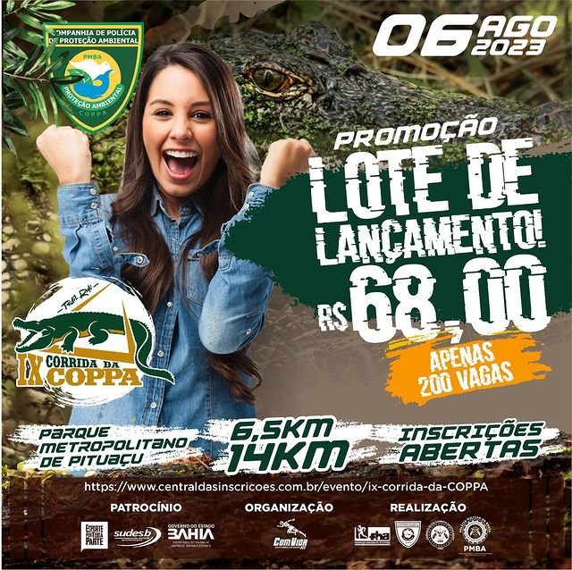 Estão abertas as inscrições para 9° edição da ‘Corrida da Coppa’, promovida pela Companhia Independente de Polícia e Proteção Ambiental (Coppa), realizada no dia 6 de Agosto, a partir das 6 horas da manhã, no Parque Metropolitano Pituaçu, em Salvador. Atletas podem se inscrever para os percursos de 6,5 e 14 quilômetros. O evento, que acontece em comemoração ao aniversário de 44 anos da unidade, é voltado para todos os públicos. Os interessados em participar podem acessar o site da Central das Inscrições e fazer o cadastro.
